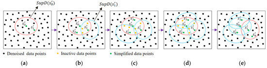 Simplification of the smoothed data points using a region growing-based technique to search within the support domain of each denoised data point for simplified data points: (a) starts with the support domain , (b) data points are divided into active points (black filled circles) and inactive points (orange filled circles) and the simplified data point is selected using Hausdorff distance criterion, (c–e) the algorithm searches among the updated active points to find simplified points and .