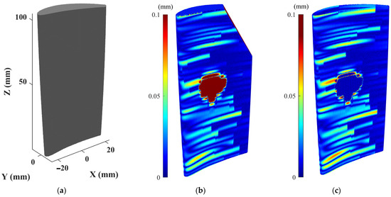 Numerical case study: (a) Nominal CAD model of the blade, (b) error colormap of the simulated point cloud (without noise and outlier) of the damaged blade, and (c) error colormap of the point cloud of the actual damage-free blade.