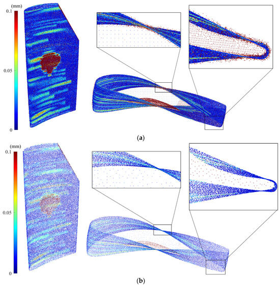 Figure 7 shows the error colormap (with respect to the CAD model) of the constructed damage-free gDT models for synthetic raw and simplified point clouds of the simulated damaged blade obtained through the CAD-to-scan non-rigid registration. Table 4 presents the average deviation of the actual damage-free gDT (Figure 5c) and constructed gDT models of the synthetic raw and simplified point clouds (Figure 7) from the original CAD model. As can be seen in Table 4, the average deviation of actual and simplified damage-free digital twins is 0.0145 mm and 0.0115 mm, respectively; that is, the percentage deviation of the average error between the two datasets is less than 21%. However, the average deviation of the synthetic damage-free digital twin from the CAD model is 0.0078 mm, indicating a percent deviation of more than 46% between the average errors of actual and synthetic damage-free digital twins. In order to guarantee the same average point spacing between two datasets in the CAD-to-scan non-rigid matching process, we have employed CAD models containing 1,144,710 and 101,332 points for damage-free digital twin construction of synthetic and simplified point clouds, respectively. It should be noted that CAD point clouds are generated by uniformly sampling the NURBS surface of the CAD model (with a specified average point spacing) while the synthetic point cloud is obtained through the random sampling of point clouds from the NURBS surface of the damaged blade. Also, due to the material missing areas on the surface of the simulated damaged blade, we expect to have fewer data points on the damaged blade point cloud with respect to the point cloud of the CAD model. Thus, the number of data points in the CAD point cloud and the synthetic point cloud is not equal. As depicted in Table 4, the computation times of CAD-to-scan non-rigid registration of the synthetic and denoised-simplified point clouds, respectively, are 22,812 and 888 s. As expected, the computation time for damage-free gDT construction of the simplified point cloud is significantly (more than 25 times) less than that of the synthetic point cloud. In each iteration of the non-rigid registration, the algorithm computes a unique correspondence and transformation matrix for each data point to project deformations to the CAD model [7]. Thus, by increasing the point cloud density, the computation time of the CAD-to-scan non-rigid registration algorithm increases. The results for the simulated point cloud data demonstrate that using the smoothed and down-sampled point cloud of the synthetic dataset effectively improves the accuracy and efficiency of generating the damage-free digital twin of the damaged blade.