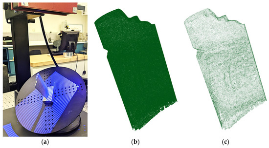 Experimental case study: (a) damaged blade being scanned by the structured-light 3D scanner, (b) corresponding raw point cloud containing measurement noises, outliers and a large number of data points (613,460 points), and (c) the denoised and simplified point cloud of the damaged blade obtained using the proposed method (47,160 points).