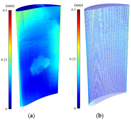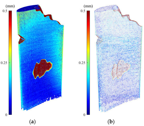 (a) Error colormaps of the synthetic raw point cloud (containing measurement noise and outliers) and (b) synthetic simplified point cloud of the damaged blade where measurement noises and outliers are effectively removed and a smooth and simplified dataset is obtained.