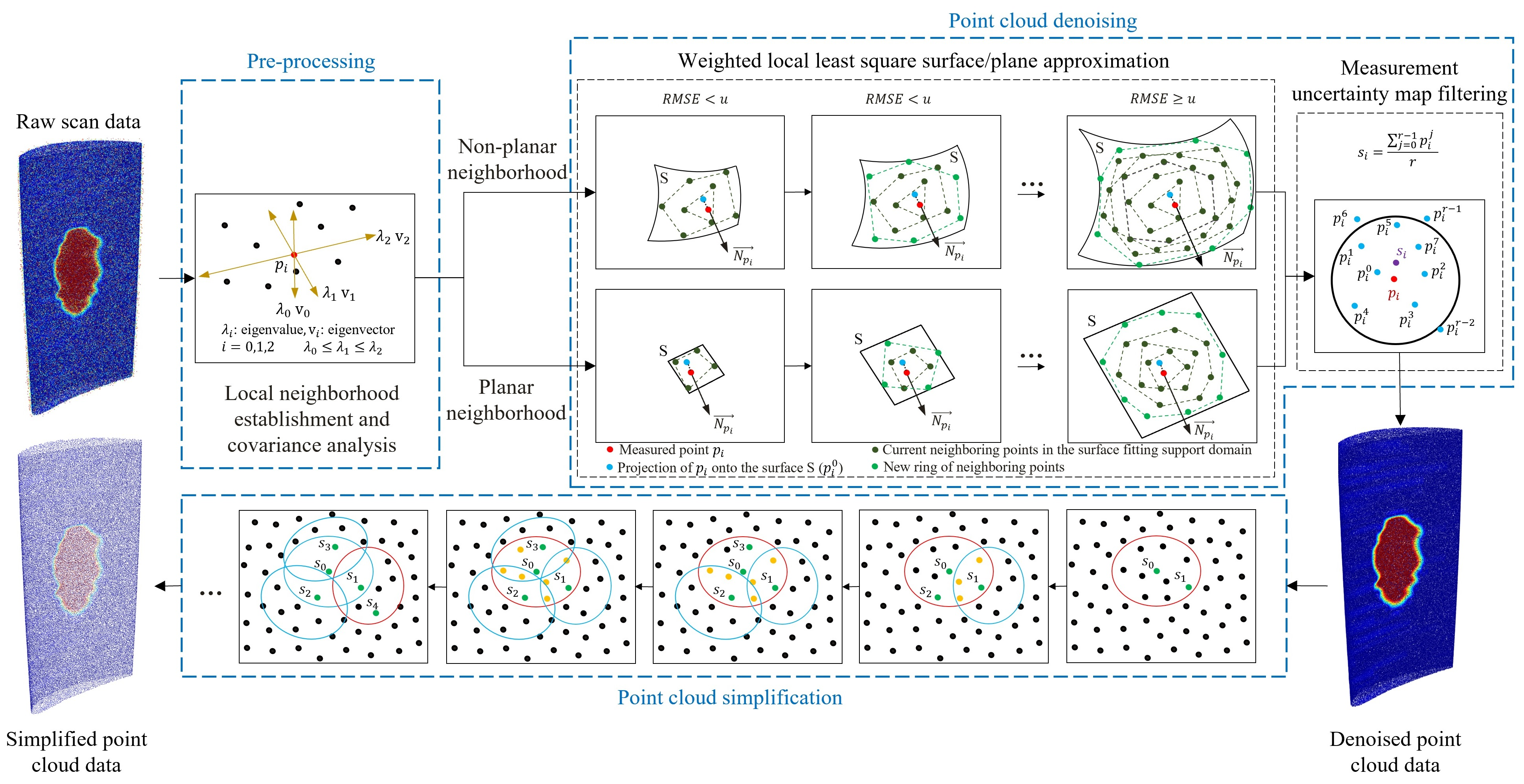 - Pre-processing: pre-processing aims to establish the local neighborhood (neighboring points) and normal direction of each data point of the raw 3D scanned point cloud and identify the type of local underlying geometry (i.e., planar or quadric surface) through principal component analysis (PCA).