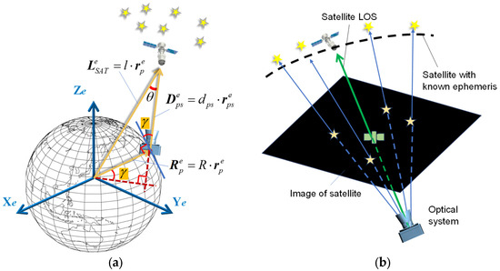 Figure 1a presents the basic principle of satellite angle measurement-based navigation and positioning: When the camera simultaneously observes the satellite and the stars, there exists the following geometric relationship among the satellite position, the position of the observer, and the satellite LOS direction: