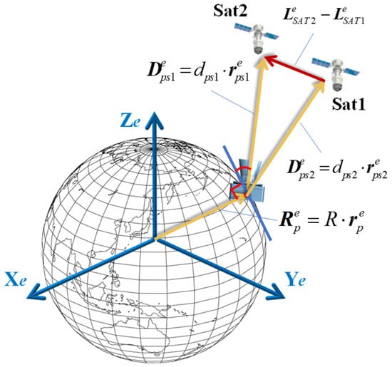 where the superscript e represents the vector in Earth-fix frame (e-frame), are the coordinates of the satellite in e-frame, l is the distance of the satellite from the geocenter, is the position of the observer, R is the distance of the observer from the geocenter, is the LOS vector of the satellite, is the satellite LOS distance, and is the satellite LOS direction. , and are all unit vectors.