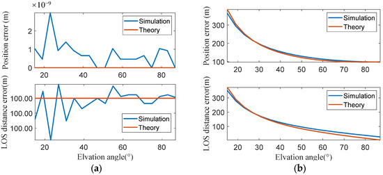 According to the error theory established in Section 3, the components of satellite orbit prediction errors perpendicular and parallel to the LOS direction exhibit distinct error propagation characteristics on geolocation results. The simulation introduced 100 m satellite orbital prediction errors in both directions parallel and perpendicular to the LOS, respectively. The observer’s position is solved with the AON method, and the geolocation errors are analyzed. The simulation and theoretical geolocation errors are shown in Figure 3. When the satellite coordinate error is parallel to the LOS direction, it can be seen that the satellite LOS distance calculation error equals the orbit prediction error, and the geolocation error remains zero under different observation conditions. When the satellite coordinates error is perpendicular to the LOS direction, both the LOS distance error and the geolocation error decrease as the satellite elevation angle increases. When the satellite elevation angle reaches 90°, the geolocation error equals the orbit prediction error . The comparison between simulation results and theoretical results given by Equations (19) and (23) show minimal deviation.