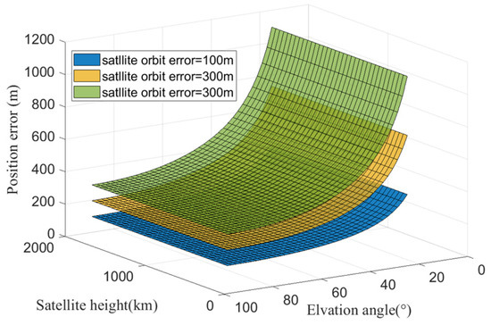 When the satellite position error is perpendicular to the LOS direction, we have . Substituting it into Equation (12), the following relationship is obtained: