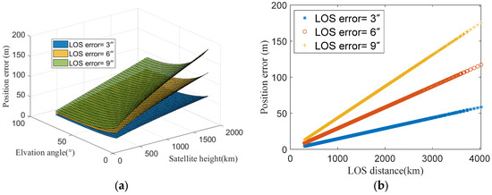 Positioning errors induced by LOS errors: (a) Positioning errors caused by LOS direction error vary with satellite elevation angle and orbital height. (b) Positioning errors are directly proportional to the LOS distance with different LOS direction errors.