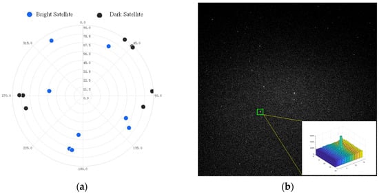 Figure 9a shows the spatial distribution of Globalstar satellites during the observation epoch, and Figure 9b presents a typical Globalstar satellite image captured in the experiment. The brightest satellite is prioritized for observation. When the apparent magnitude of the tracked satellite exceeds Mv7.0, the optical system will automatically track the other brighter one with the aid of the two-axis rotator.