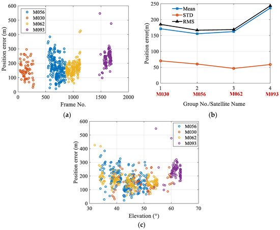 The experiment observed four Globalstar satellites (namely, M056, M030, M062, and M093) sequentially and calculated the observer’s position using the captured satellite images. The geolocation errors are shown in Figure 10a. It can be seen that the geolocation errors are mainly distributed between 100 m and 300 m, with the maximum error less than 600 m. Figure 10b shows the mean, standard deviation (STD) and root mean square (RMS) values of the positioning errors for each satellite. The STD errors for each satellite is less than 70 m, and the mean error is less than 250 m. These results indicate that the orbital parameters provided by Globalstar satellites have relatively high accuracy, demonstrating the strong feasibility of the AON method via Globalstar satellite observations. Satellites at low elevation angles have longer LOS distances and lower apparent magnitude, and are prone to being affected by atmospheric refraction and stray light. These factors introduce larger LOS direction errors. Figure 10c illustrates the geolocation errors corresponding to satellite elevation angles.