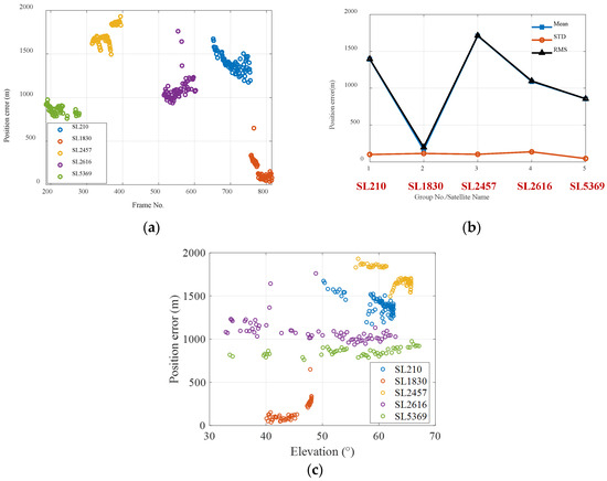Furthermore, five groups of observed Starlink satellite images (namely, SL210, SL1830, SL2457, SL2616, and SL5369) were also used for positioning calculation. The geolocation errors are shown in Figure 11a. It can be seen that the positioning error when observing the Starlink satellites is much greater than that when observing the Globalstar satellites. Figure 11b shows the mean, STD, and root mean square values of the positioning errors for each satellite. The mean position errors range from 200 m to 1700 m, and the STD errors remain about 100 m. Figure 11c shows the geolocation errors corresponding to elevation angles of the observed Starlink satellites.