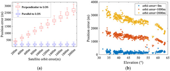 The geolocation errors induced by the satellite position errors: (a) The statistical results of geolocation errors in different directions. (b) The geolocation errors with respect to elevation angles.