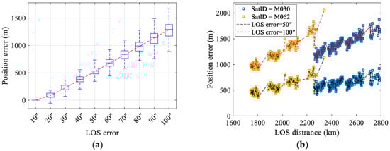 A group of satellite observation data with higher SNR (satellite ID is M056) was selected for AON positioning calculation, and LOS direction errors were added to the original data. When different magnitudes of LOS direction errors (10″~100″) were introduced, the statistical results of geolocation errors are shown in Figure 13a. It can be observed that the geolocation errors increase approximately linearly with the growth of LOS direction errors. Figure 13b presents the geolocation errors corresponding to LOS distance when LOS direction errors are set to 50″ and 100″, respectively. The results show that the geolocation errors grow approximately linearly with increasing LOS distance, and a larger LOS direction error accelerates the growth trend of the geolocation errors.