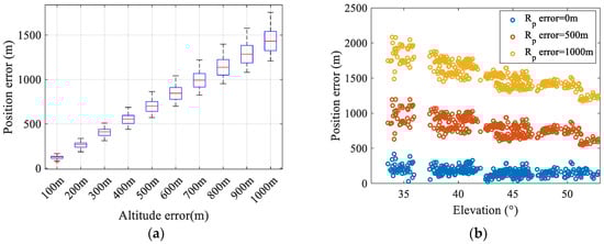 The impact of altitude errors on geolocation results: (a) The statistical result of geolocation errors induced by altitude errors. (b) The impact of altitude errors on geolocation errors with respect to elevation angles.