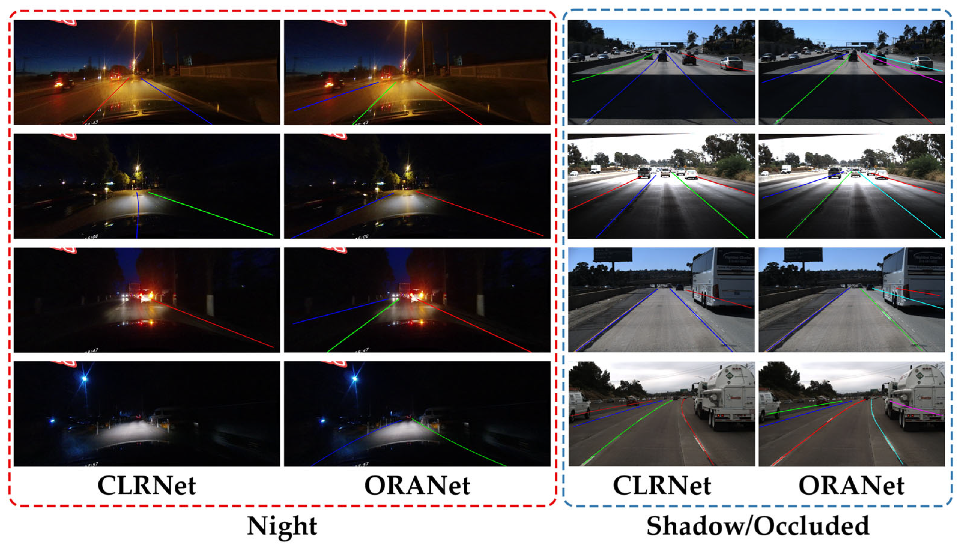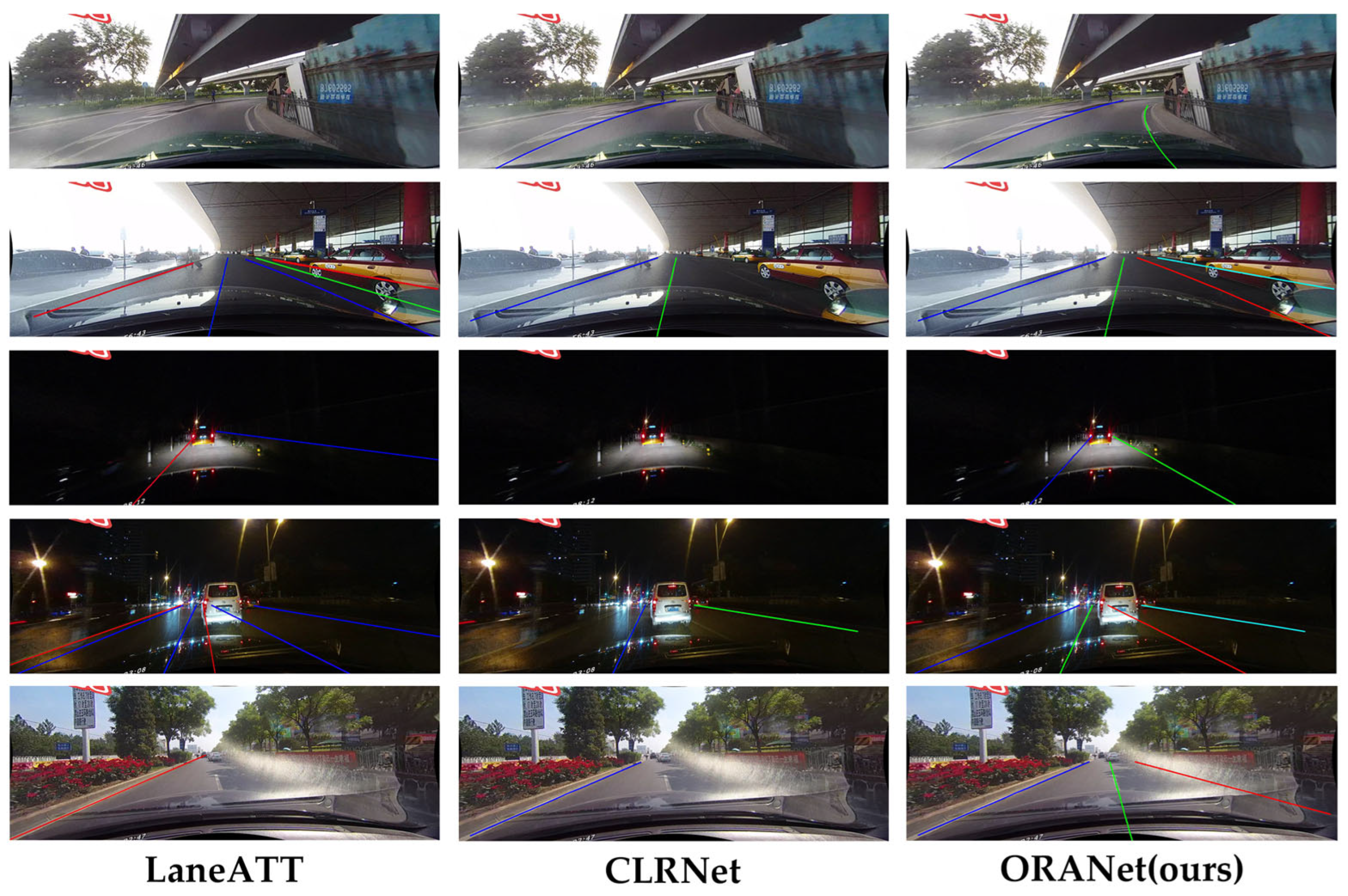 - Zheng, T.; Huang, Y.; Liu, Y.; Tang, W.; Yang, Z.; Cai, D.; He, X. CLRNet: Cross Layer Refinement Network for Lane Detection. In Proceedings of the 2022 IEEE/CVF Conference on Computer Vision and Pattern Recognition (CVPR), New Orleans, LA, USA, 18–24 June 2022; IEEE: New York, NY, USA; pp. 888–897. [Google Scholar]