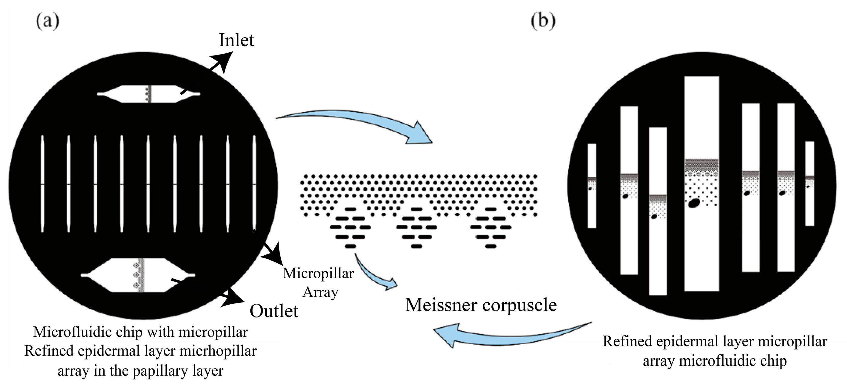 To overcome this limitation, a biomimetic skin microfluidic platform was developed to replicate the structural features of the dermal papillae and Schwann cells in both geometry and spatial arrangement. This platform was integrated with a dynamic mesh method to simulate and experimentally analyze the flow fields under normal and tangential vibrations at 20 Hz. The results show that normal vibration leads to the formation of localized vortices along the short axis, while tangential vibration generates stable laminar flow and a planar shear field along the long axis. These observations support a direction-specific mechanism underlying low-frequency vibration sensing in Meissner corpuscles. The study provides a physical basis for understanding tactile signal transduction and supports the development of biomimetic sensors with directional sensitivity.