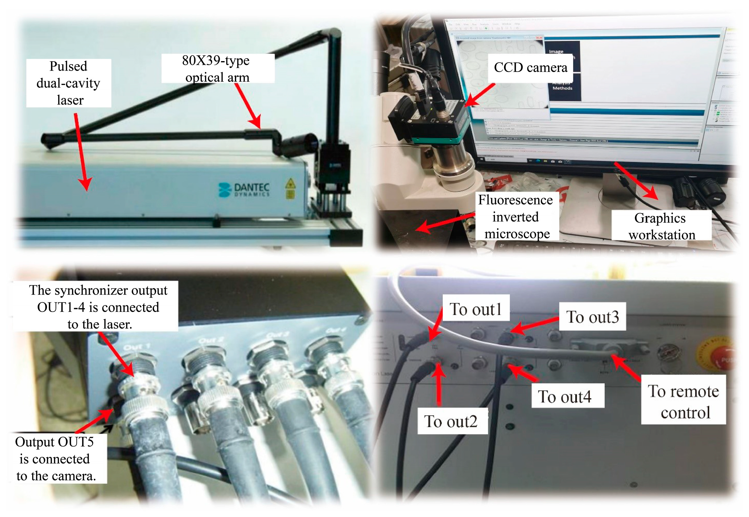 Figure 4 presents a quantitative analysis of the flow field derived from tracer particle motion. Using Particle Image Velocimetry (PIV), the particle distribution data were converted into a detailed velocity field. The figure illustrates multiple aspects of the fluid dynamics: the time-averaged velocity contour map (a) provides an overall representation of stable flow characteristics, while the instantaneous velocity field (b) and vector map (d) capture transient variations in flow magnitude and direction. This analysis is essential for validating the experimental methodology and transforming qualitative visual data into robust quantitative measurements. It forms the foundation for the subsequent evaluation of shear stress distribution and flow pattern evolution.