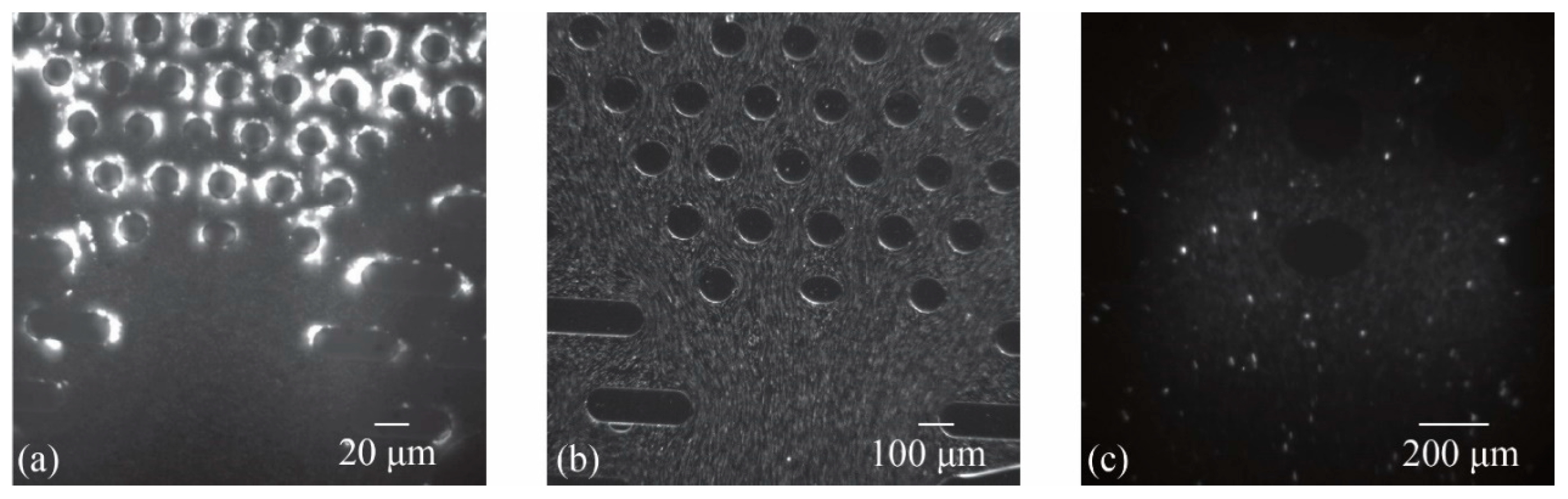 Figure 3 shows representative snapshots of fluorescent tracer particle distribution within micropillar arrays of different sizes. These images present the raw visual data captured during the experiments. While each frame displays static particle positions, it is the sequential analysis of particle movement across frames that yields quantitative flow field information. This analysis forms the basis for generating velocity and streamline maps, enabling the investigation of fluid behavior around Schwann cells and its potential role in Meissner corpuscle function.