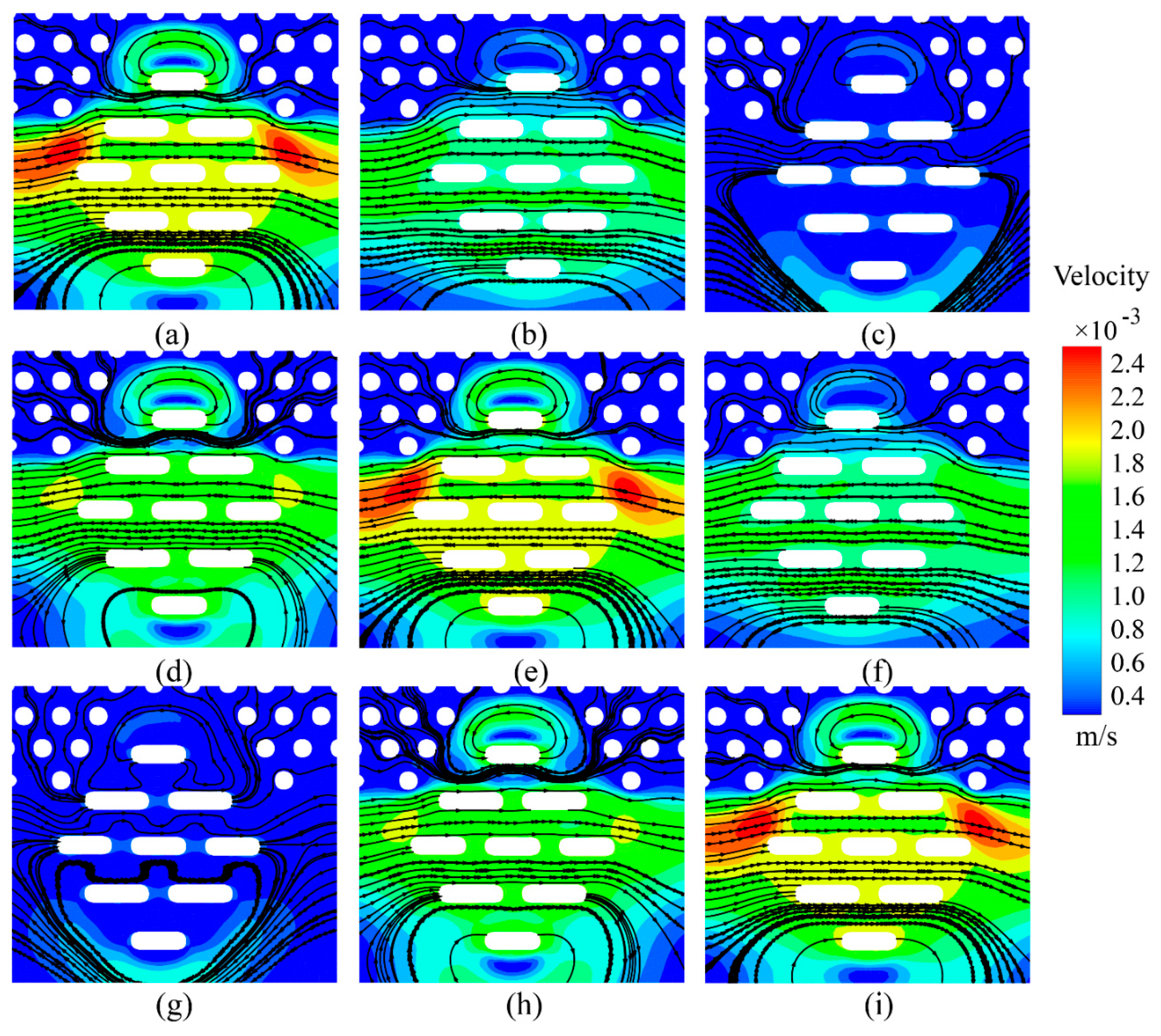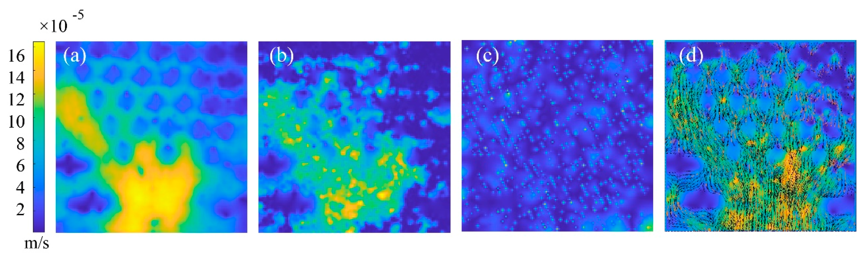 Figure 7 illustrate qualitatively different flow patterns. To quantify these differences, peak fluid velocities were compared. Under normal vibration, the fluid is directed through more complex and tortuous paths, leading to the development of localized vortices and a peak velocity of approximately 2.38 × 10