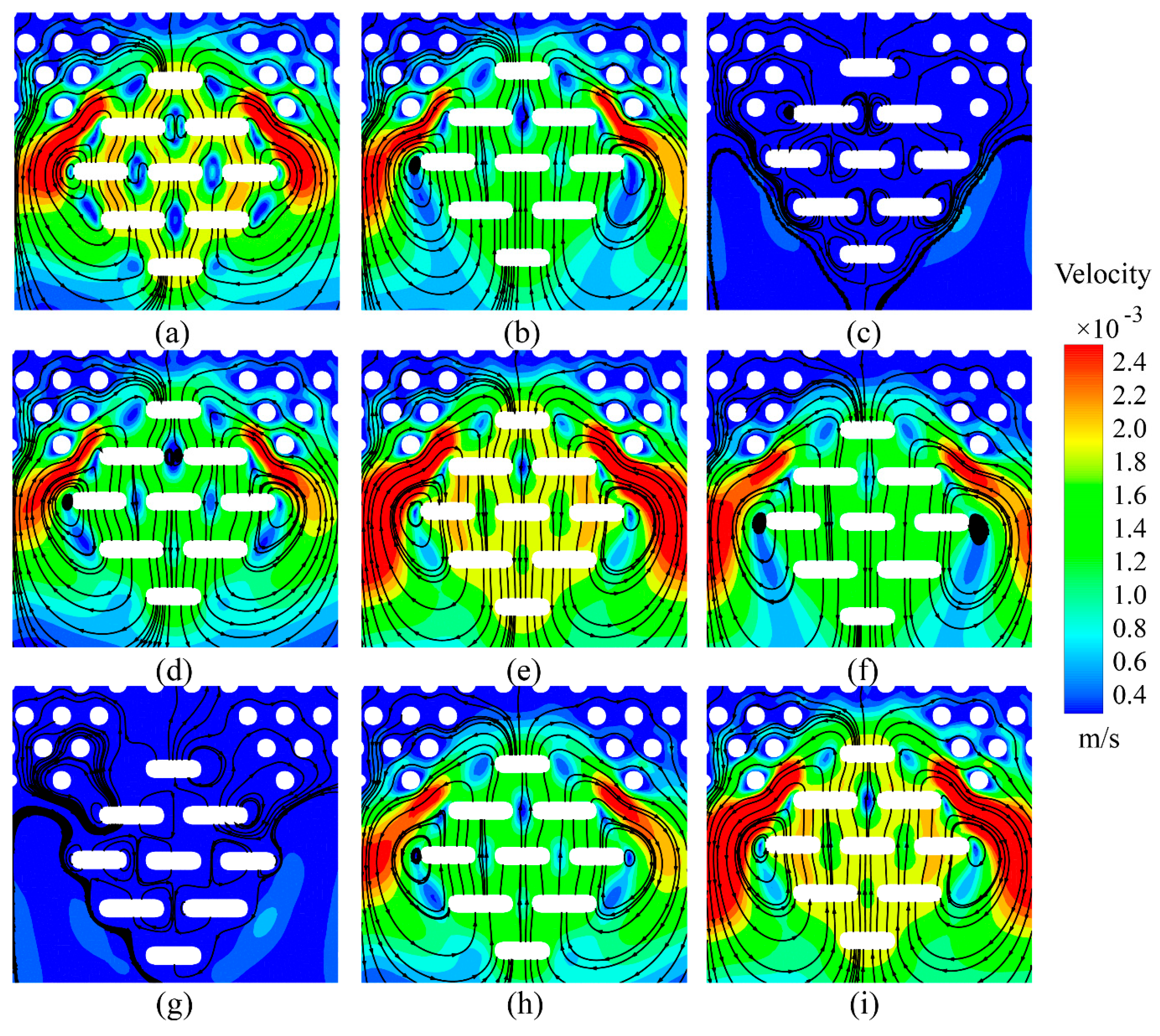 Figure 7 shows the velocity contours and streamline plots at various time points within a single vibrational cycle. Panels (a), (b), (c), (h), and (i) correspond to the rightward phase of motion, while panels (d), (e), (f), and (g) depict the leftward phase. Due to the influence of the surrounding papillary structure, localized high-velocity regions can be observed in the superolateral areas during vibration. A comparison of panels (a), (e), and (i) suggests that the flow velocity on the side corresponding to the direction of motion is slightly elevated, but the extent of the high-velocity region is smaller than that seen in the normal vibration case.