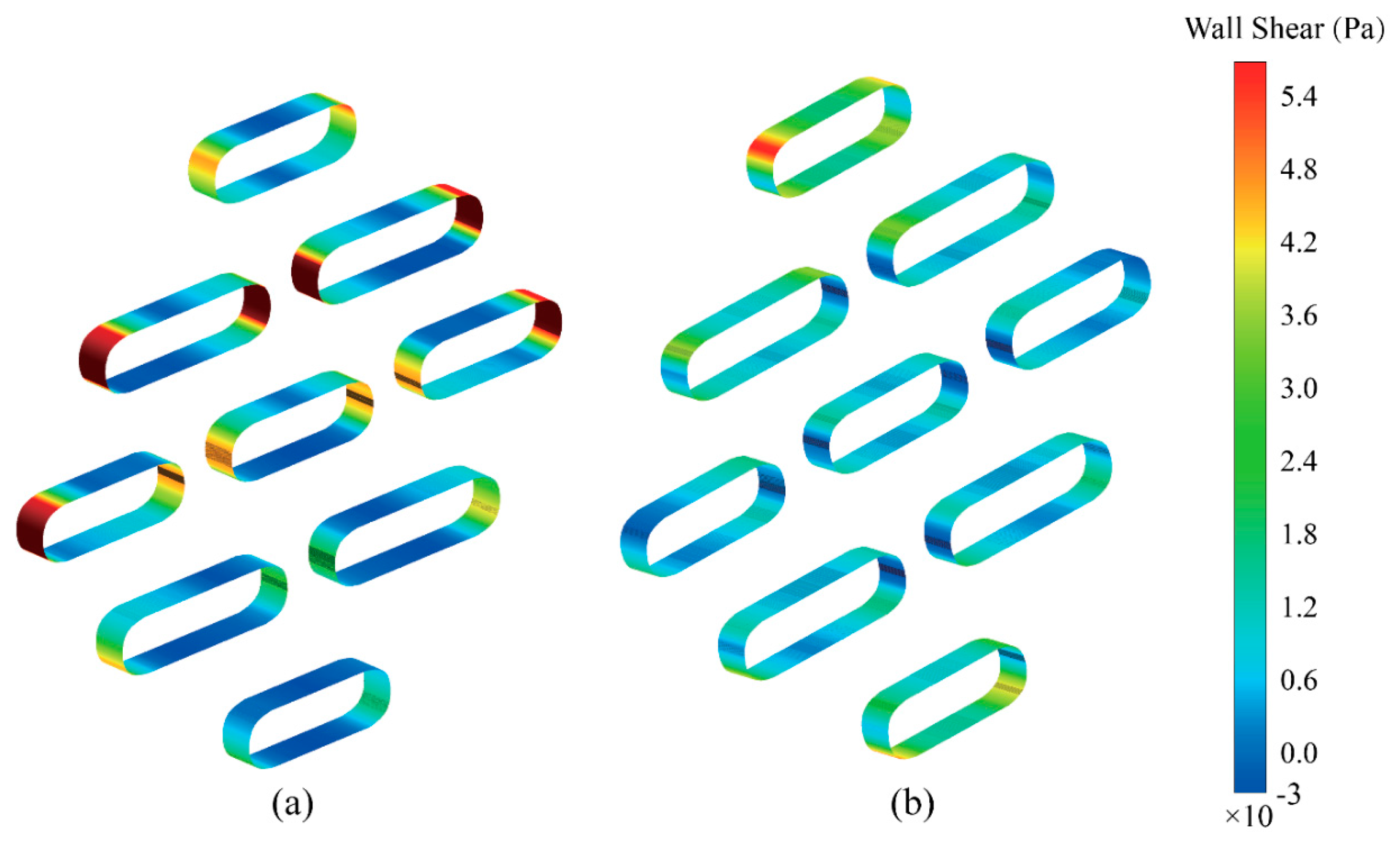 Figure 8b) is characterized by smoother streamlines and results in a lower average shear stress of approximately 0.0012 Pa along the long axis.