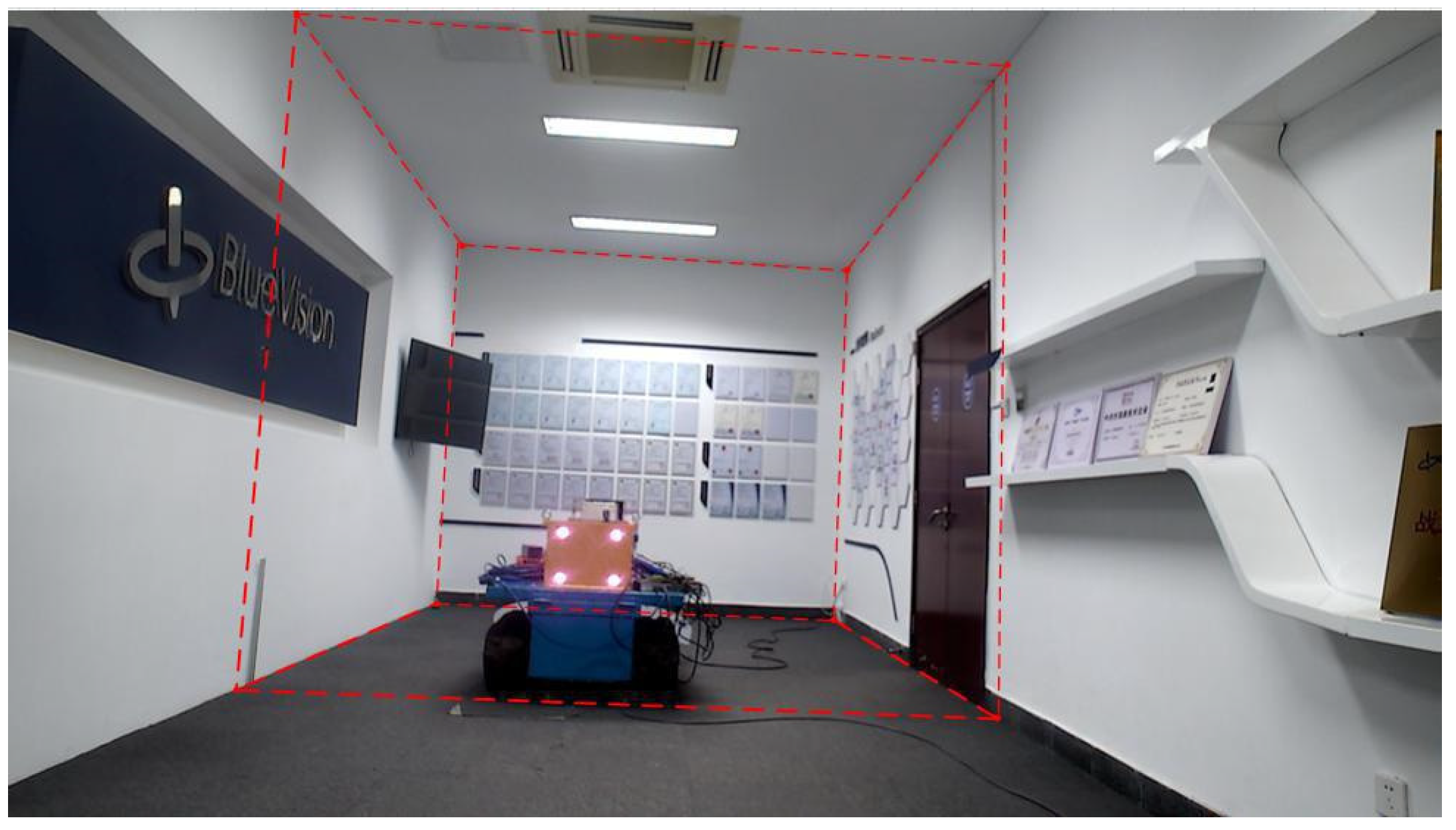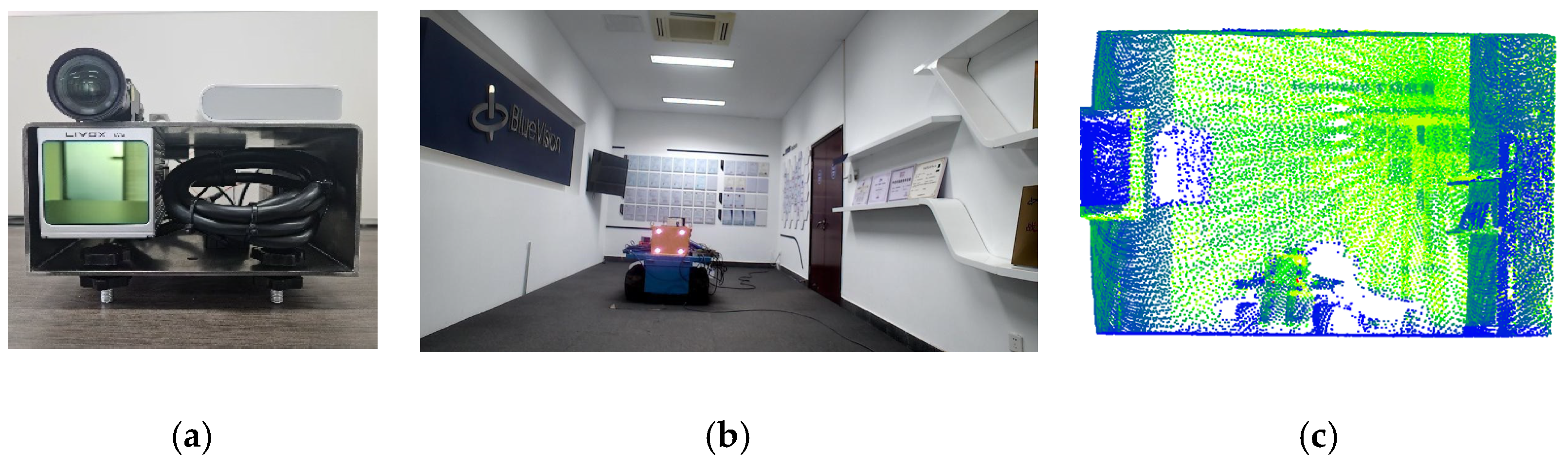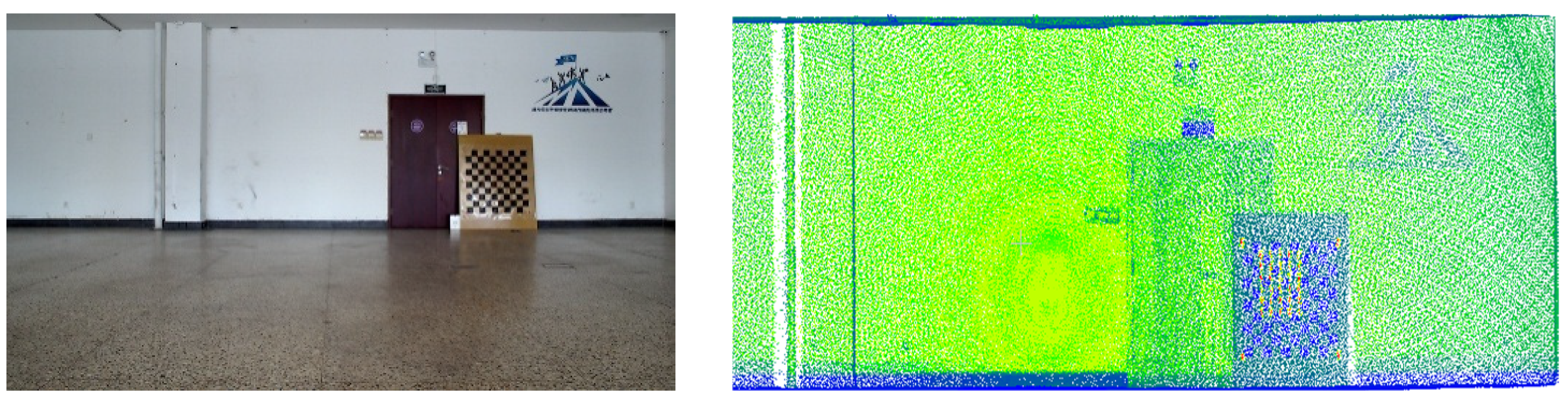 To visualize three-dimensional information in two-dimensional images, we integrated a LiDAR system with a camera and performed calibration. In the experiments, a Livox-Avia LiDAR (range random error < 2 cm, angular random error < 0.05°, manufactured by Livox Technology Co., Ltd., Shenzhen, China) and a MindVision industrial camera (resolution 1920 × 1080, manufactured by MindVision Technology Co., Ltd., Shenzhen, China) were employed. The Livox-Avia LiDAR operates in a non-repetitive scanning mode, continuously outputting point clouds in dual-echo mode at a rate of 480,000 points per second. Before performing LiDAR-ca-era registration, multiple checkerboard images were captured from different viewpoints using the camera, and the camera intrinsic parameters were estimated with Zhang’s calibration algorithm. Subsequently, multi-view camera images and LiDAR point clouds containing the calibration board were synchronously acquired, from which corner points in the images and echo features in the point clouds were extracted for feature matching. Based on these correspondences, a nonlinear Levenberg-Marquardt optimization algorithm was applied to estimate the six-degree-of-freedom rigid transformation between the two sensors, i.e., the rotation matrix