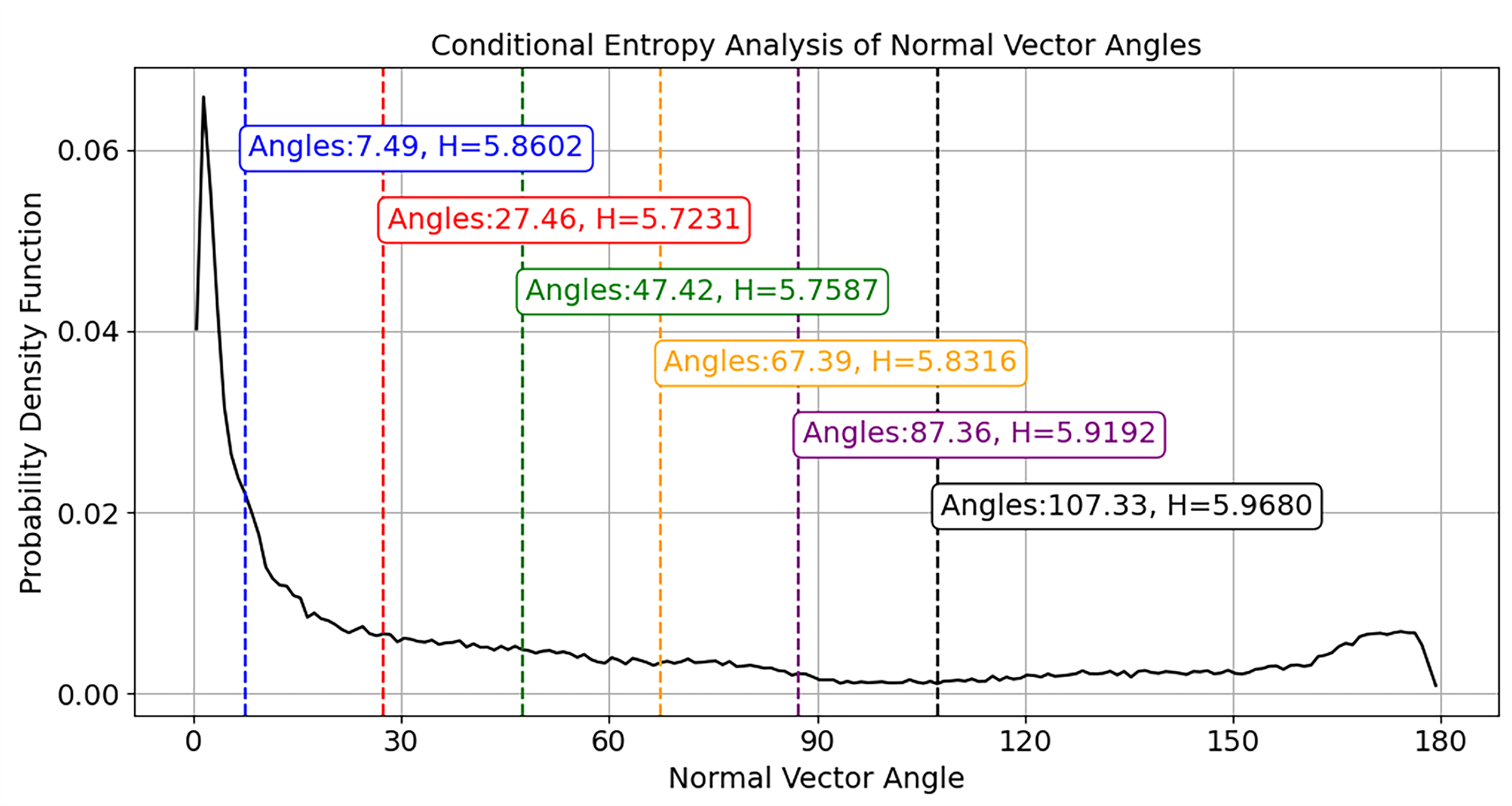 Figure 6 illustrates the optimal curvature threshold determined via conditional entropy analysis of normal vector angles, where the red dashed line corresponds to the threshold yielding minimal entropy