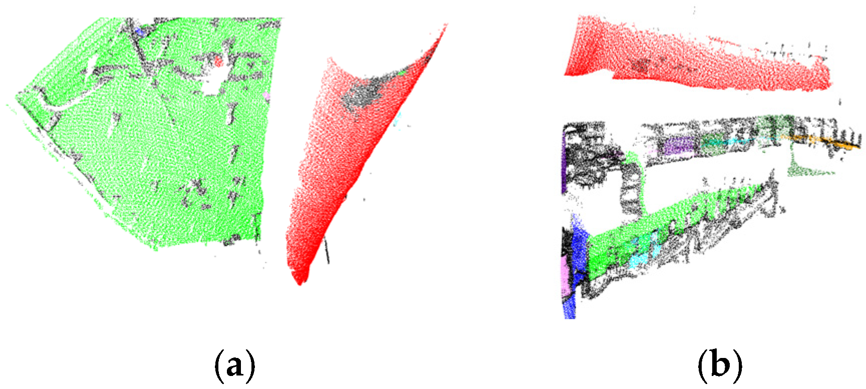19]. The eigenvector corresponding to the smallest eigenvalue is the normal vector. Meanwhile, the curvature estimate of the point is calculated using the eigenvalues, with smaller curvature values indicating flatter regions. Region growth is then performed by sequentially selecting points with the smallest curvature as seed points, using the normal vector angle threshold as a constraint to detect planes in the point cloud.