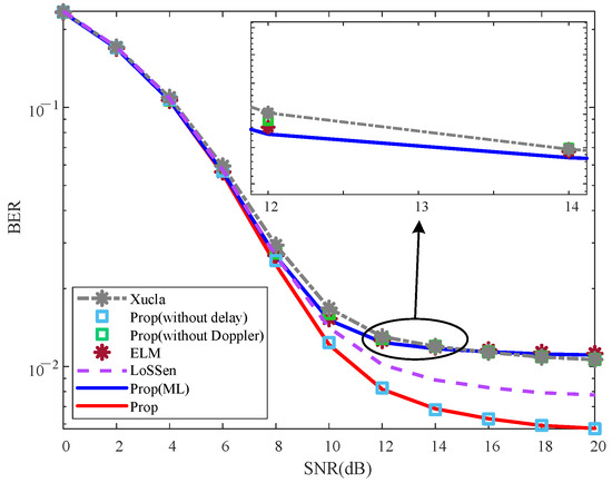 To verify the BER performance against the impact of v, Figure 7 plots the BER curves. For each given v and SNR, the BER values of “Prop” and “Prop (without delay)” are similar and smaller than those of “Xucla” and “Prop (without Doppler)”. As observed from Figure 7, with the increase in v, the changes in BER of “Xucla” and “Prop (without Doppler)” are not readily apparent. On the contrary, the BERs of “Prop” and “Prop (without delay)” decrease as v increases, and this could be interpreted as the proposed method improving the BER performance via refining the recovery accuracy of the downlink CSI. Namely, “Prop” and “Prop (without delay)” refine the recovery accuracy of the downlink CSI by denoising processing that utilizes the Doppler shift prior information, and then use the refined downlink CSI for SIS to recover UL-DS. Therefore, an increase in v has the same impact on the BER of UL-DS as it does on the NMSE of downlink CSI. In a word, when compared with “Xucla” and “Prop (without Doppler)”, the proposed method improves the BER performance against the impact of v.