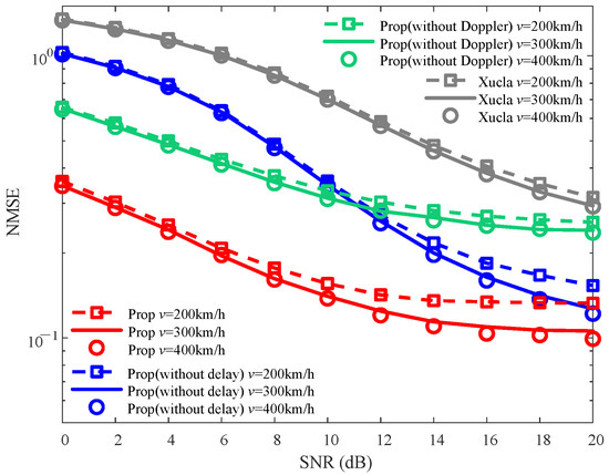 The impact of varying v (i.e., km/h, km/h, and km/h) on the NMSE curves is presented in Figure 6. From Figure 6, it is evident that for each given v across the entire SNR range, the NMSEs of “Prop” are smaller than those of “Xucla”, “Prop (without delay)”, and “Prop (without Doppler)”. With the decrease in v, the NMSEs of “Xucla” and “Prop (without Doppler)” are changed slightly. The reason is that the speed v affects the Doppler shift, while the Doppler shift prior information is not utilized in “Xucla” and “Prop (without Doppler)”. On the contrary, for “Prop” and “Prop (without delay)”, the NMSEs decrease with the increase in v, and vice versa. This behavior is attributed to the fact that increased v leads to a larger Doppler shift in the downlink CSI, which is closer to the pre-defined Doppler boundary value at the given resolution of the path Doppler shifts. Thus, the denoising processing utilizing the Doppler shift prior information achieves a higher accuracy for interference suppression in the Doppler dimension. On the whole, against the variations in v, the NMSEs of “Xucla”, “Prop (without delay)”, and “Prop (without Doppler)” are reduced by using “Prop”.