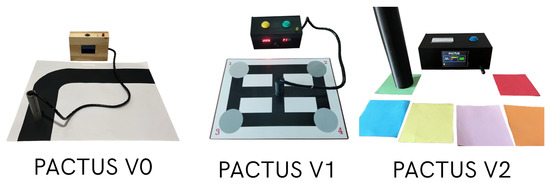 PACTUS 1.0, which uses several A3 laminated cards, each containing up to three game boards. The patients performed repetitive exercises with audiovisual feedback and a point system. With a simple interface, multiple game modes, and adjustable difficulty, it proved usable and safe for chronic stroke patients (those more than six months post-stroke [30]). The interaction was achieved via a sensorized handle using the analog TCRT5000 infrared sensor (Vishay Semiconductors, Malvern, PA, USA), which allowed us to implement various shades of gray in a series of colored circuits printed on game boards. Feedback from the clinical team then guided improvements incorporated into the new PACTUS prototype.