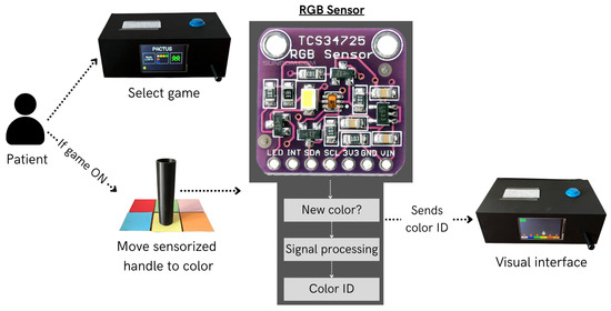Therefore, PACTUS 2.0, replaces the infrared sensor with an RGB sensor. The grip was redesigned for greater stability and robustness and wirelessly eliminated cumbersome cables for the patient. Now, the handle reads a wider range of colors and sends the color identifier (color ID) wirelessly to the central station, which processes it and drives three Serious Games (SG) designed for neurorehabilitation based on the detected color. A sample of the three devices is shown in Figure 1.
