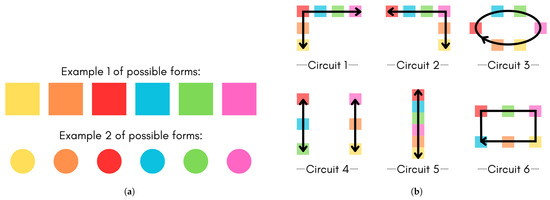 Comparative view of geometric shapes and circuit configurations. (a) Different possible colored geometric shapes; (b) possible configurable circuits for upper-limb movements (arrows).