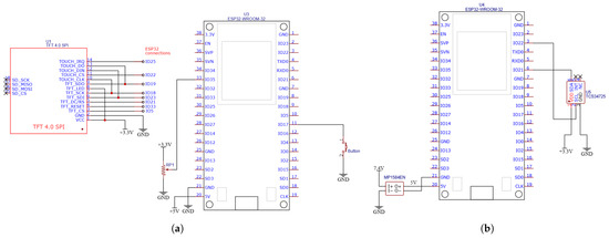 - Touchscreen TFT display: A 2.8-inch ILI9341 TFT LCD display module (Shenzhen HiLetgo E-Commerce Co., Ltd., Shenzhen, China) was initially chosen and then replaced by 4-inch TFT LCD touch display module, 480 × 320, ST7796S (Shenzhen Hongshuyuan Technology Co., Ltd. [LAFVIN], Shenzhen, China). It communicates with the microcontroller via the SPI.