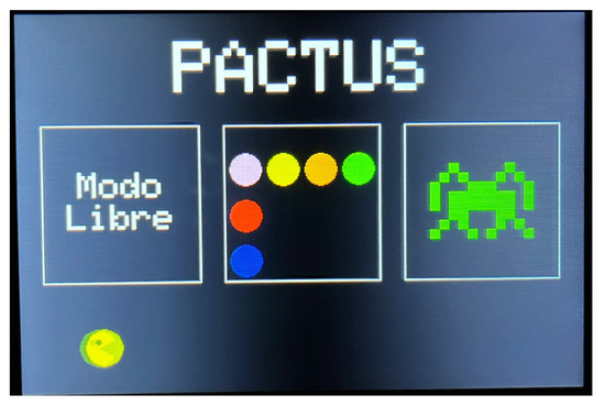 PACTUS 2.0 main menu, with the option to select (by tapping the screen) any of the games. It features a small PACMAN animation to make the GUI more user-friendly.