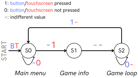 The high-level logic is structured as a three-state finite-state machine (S0–S2). State S0 serves as the root: it initializes after boot and exiting any game, renders the main menu, and waits for a touch that selects a game. An explicit transition to S1 occurs as soon as the user taps one of three active menu areas. S1 is a brief pre-start state; for Game 2 (Feeding PACMAN), it displays setup instructions, while for all games, it shows a 3 s countdown with a color change (red → yellow → green) to give the player time to prepare. When the countdown ended, the system entered S2, where the main loop of each game ran.