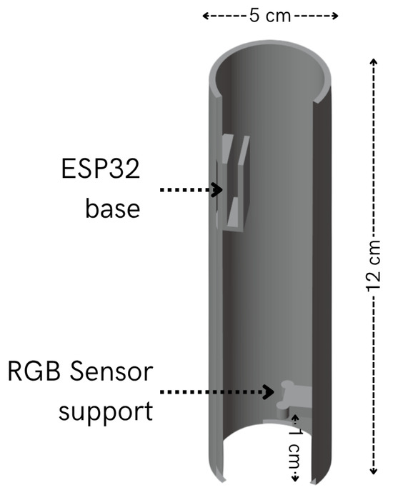Both the TFT display station and sensorized handle had 3D-printed housings. The handle and its features are illustrated in Figure 8. As can be seen, the grip was 5 cm in diameter, the recommended size according to [24]. This size is intended to provide a more comfortable grip than PACTUS 1.0. The interior also offers a base to support the ESP32 and the sensor, which are separated from the surface by 1 cm.