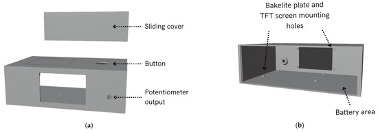 Figure 9 shows the front and back views of the central station. The system has anchorages for the Bakelite plate, where the electrical circuit is soldered, and for the TFT display. The system also had a sliding cover for accessing the interior, a hole for the button, and an exit output for the potentiometer.