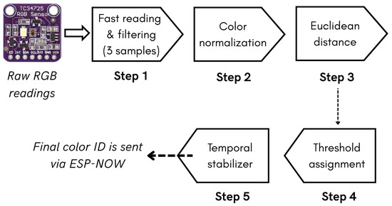 The TCS34725 sensor provides digital readings of the RGB components of colors. However, these signals must be processed for application to the PACTUS 2.0 system. This is mainly because transitions from one color to another may, in some instances, send the incorrect color ID. This would result in errors in executing and controlling the selected SG, thus worsening the gaming experience.