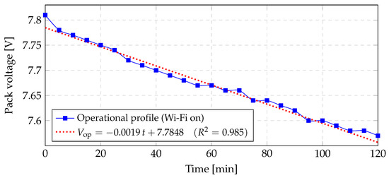 To measure the consumption of the sensorized handle, a two-hour session of playing with PACTUS 2.0, was simulated in the laboratory. The battery voltage-level samples were taken every five minutes. This was intended to calculate the following values relevant for estimating battery discharge: