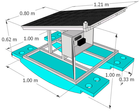The water quality monitoring system is built on a 1 × 1 m floating platform, featuring a control box, solar panel, and sensor chamber placed in a still-water channel to minimize wave interference. The structure is made of galvanized steel or aluminum and mounted on two pontoons, anchored by rope and concrete blocks. A 12 V solar panel and battery supply power via an IP65 control box. The system includes grounding to prevent signal noise, especially for pH and DO probes, ensuring long-term operation in tilapia aquaculture settings. The floating platform structure is shown in Figure 4.