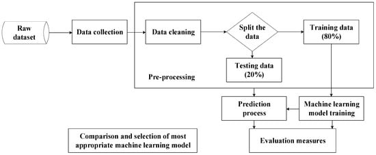 The development process of the environmental control algorithm for tilapia farming using machine learning is illustrated in Figure 5. It began with collecting raw data from sensors and other sources, followed by organizing and cleaning the dataset. During preprocessing, outliers were detected using the interquartile range (IQR) method (values outside [Q1 − 1.5 IQR, Q3 + 1.5 IQR]) and removed. Missing values representing less than 5% of the dataset were imputed using linear interpolation, while larger gaps were excluded. Sensor calibration procedures were applied prior to data integration, as described in Section 3.1, to ensure the reliability of input variables.