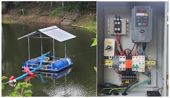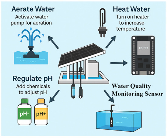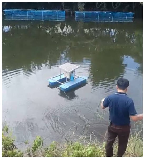 The water quality control system, as illustrated in Figure 6, was designed to respond proactively to environmental changes in the aquaculture pond. The control process begins with dissolved oxygen (DO) regulation: when DO drops below 6 mg/L, an adjustable aerator is automatically activated until levels rise to the optimal range of 6.2–6.4 mg/L. For pH control, if the measured value exceeds 8.0, a weak acid dosing pump operates in a stepwise manner to gradually bring the pH into the safe range of 7.0–8.0, with overshoot protection in place. Additionally, a 500-watt heater powered by a solar inverter is used to raise the water temperature locally near the floating platform by 1–2 °C, helping to stimulate schooling behavior in tilapia during cooler early morning hours [20].