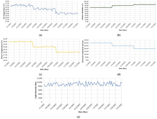 Environmental parameters recorded by the water quality monitoring system: (a) air temperature (°C), (b) relative humidity (%), (c) water temperature (°C), (d) electrical conductivity (μS/cm), and (e) light intensity (lux).