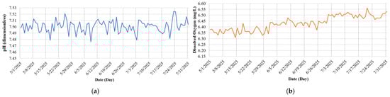 Figure 9 presents the daily average measurements of key water quality parameters in the tilapia pond from May to July 2025. Figure 9a shows that the pH level remained relatively stable, fluctuating within a narrow range of 7.48 to 7.52, with an overall average of approximately 7.50—indicating favorable conditions for aquatic life [24]. Figure 9b illustrates a slight upward trend in dissolved oxygen (DO) concentration, increasing from around 6.30 to 6.55 mg/L, reflecting an environment conducive to the health and growth of tilapia [25].