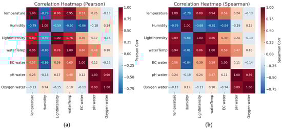Figure 10 illustrates correlation coefficients among environmental and water quality variables in a tilapia pond. Subfigure (a) presents Pearson correlation [27], suitable for linear relationships, revealing strong associations between air and water temperature (r = 0.95) and between pH and dissolved oxygen (r = 0.90), while humidity shows a strong negative correlation with temperature (r = −0.79). Subfigure (b) shows Spearman correlation, appropriate for nonlinear or non-normally distributed data, with similar trends observed—air temperature correlates with water temperature (ρ = 0.94), and pH remains highly associated with dissolved oxygen (ρ = 0.89) [28]. Using both Pearson and Spearman methods provides a comprehensive view of variable relationships across linear and monotonic patterns.