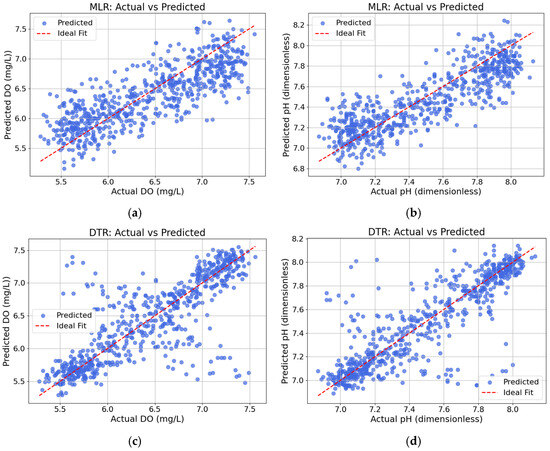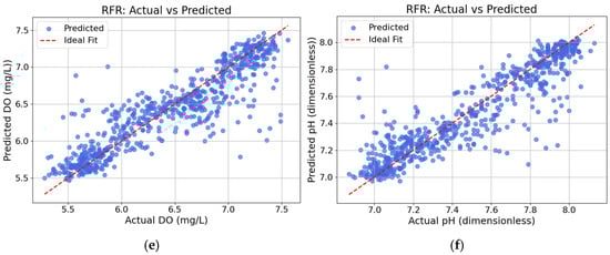 Figure 11 compares actual and predicted values for DO (a, c, e) and pH (b, d, f) across the MLR, DTR, and RFR models. MLR results (a–b) show that pH predictions align closely with the ideal line. DO predictions exhibit greater deviation, particularly at the extremes, reflecting MLR’s limitations in capturing nonlinear DO patterns. DTR predictions (c–d) improve accuracy, especially for pH, where data points cluster tightly along the ideal line. DO predictions, though better than MLR, still show some dispersion due to temporal or external variability. RFR (e–f) yields the most accurate results, with both DO and pH predictions densely following the ideal fit, indicating superior model stability, lower bias, and stronger handling of complex interactions.