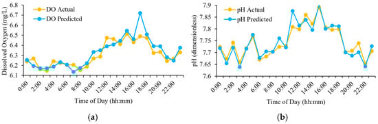 Hourly comparison between actual and predicted values of (a) DO and (b) pH.