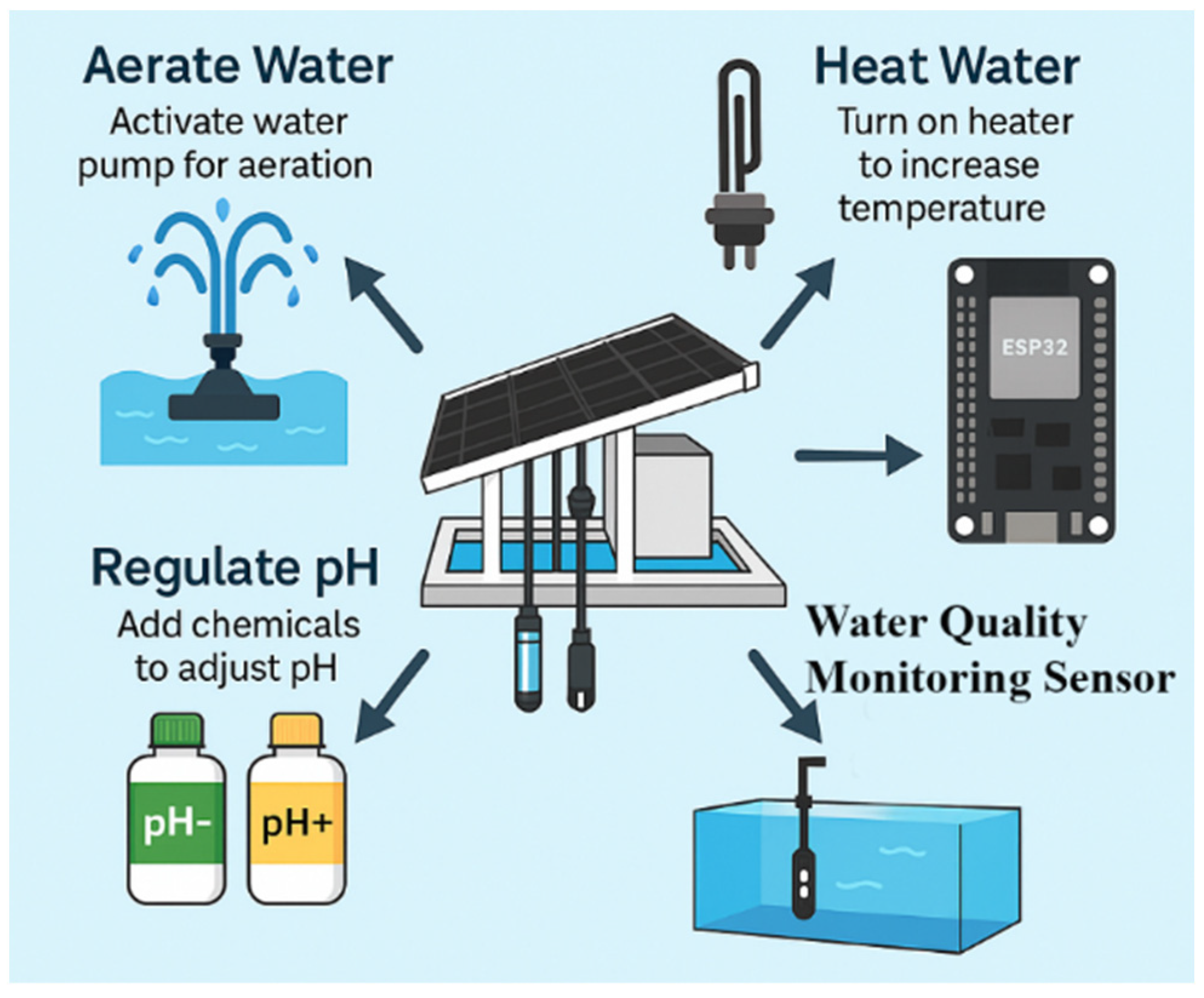 Figure 6, was designed to respond proactively to environmental changes in the aquaculture pond. The control process begins with dissolved oxygen (DO) regulation: when DO drops below 6 mg/L, an adjustable aerator is automatically activated until levels rise to the optimal range of 6.2–6.4 mg/L. For pH control, if the measured value exceeds 8.0, a weak acid dosing pump operates in a stepwise manner to gradually bring the pH into the safe range of 7.0–8.0, with overshoot protection in place. Additionally, a 500-watt heater powered by a solar inverter is used to raise the water temperature locally near the floating platform by 1–2 °C, helping to stimulate schooling behavior in tilapia during cooler early morning hours [