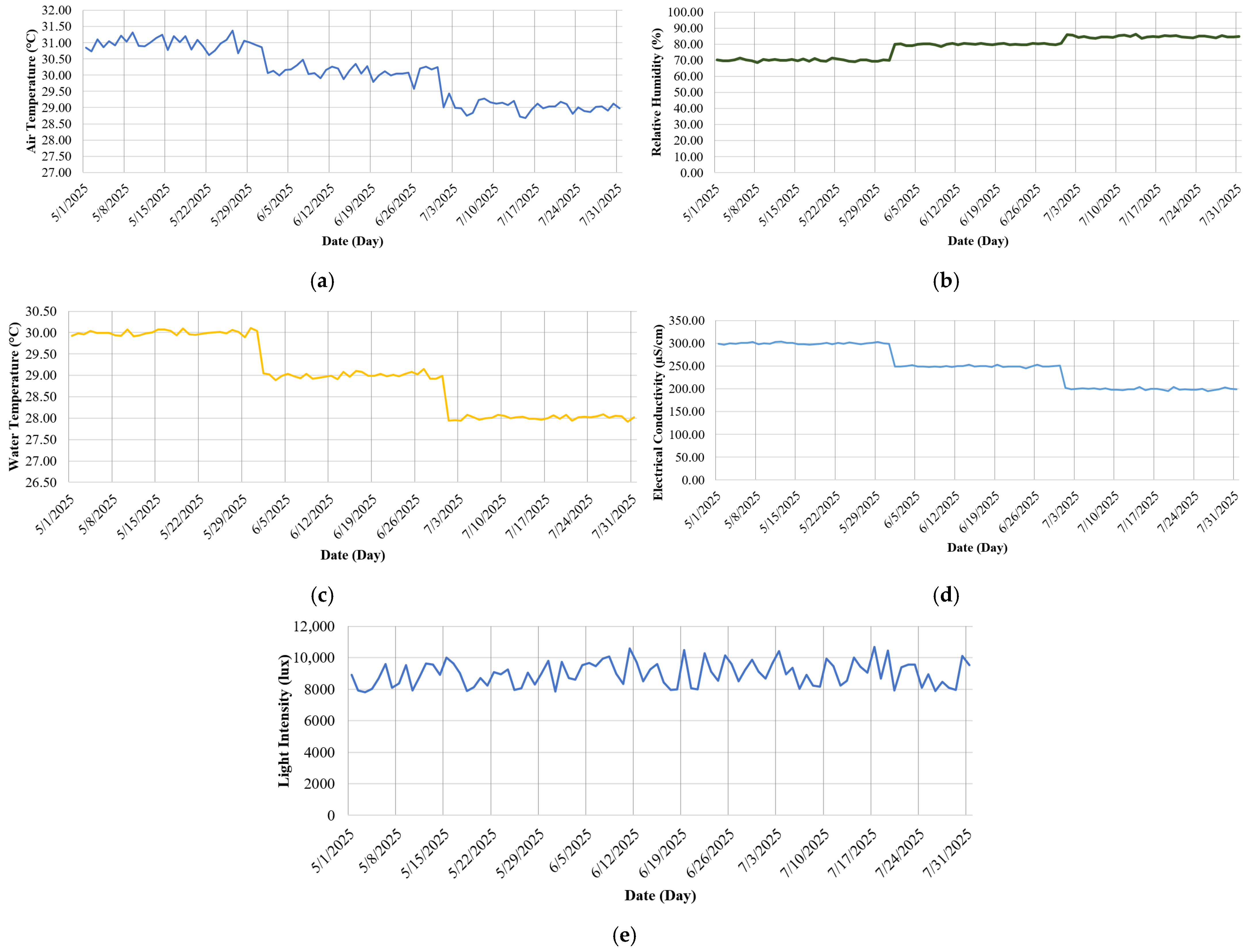 Continuous monitoring of water quality parameters over three months (May–July 2025) revealed distinct seasonal patterns affecting pond ecology. A gradual decline in air temperature (from 31.5 °C to ~29 °C) aligned with increased rainfall, which concurrently lowered water temperature—impacting tilapia behavior, particularly their morning aggregation [
