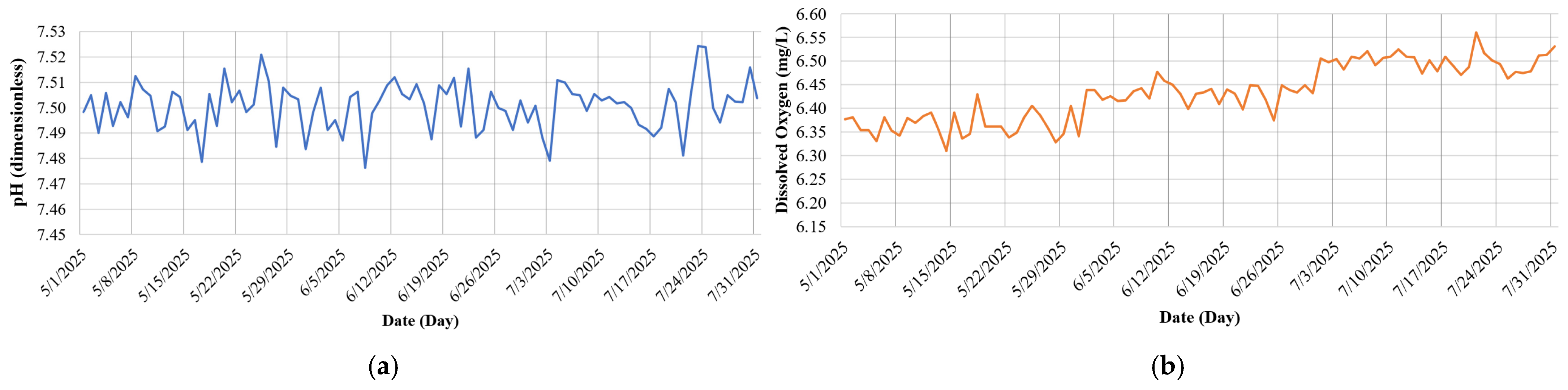 18]. To further ensure data reliability, both sensors were factory-calibrated before deployment and recalibrated in the field at two-week intervals. The pH sensor was adjusted using three standard buffer solutions (pH 4.0, 7.0, and 10.0), while the DO sensor employed a two-point method with air-saturated water and sodium sulfite solution for zero-oxygen reference, as shown in